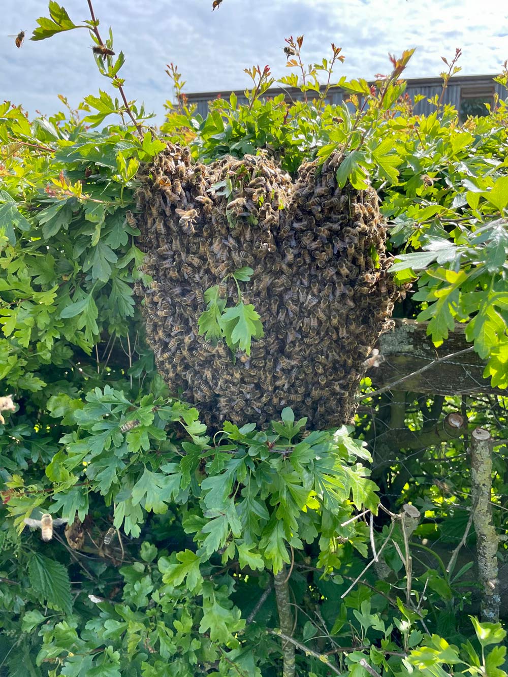 Eventually they may choose to alight in your favourite tree, garden bush or even the bird table, in what’s known as a cluster. Between April and June honeybees will follow their queen to find a new home. Remain calm, and it is sensible to keep your distance and keep children and pets indoors.